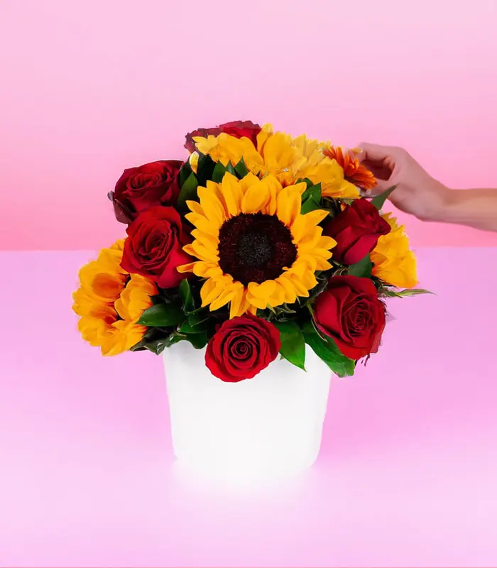 Una de las combinaciones que más enamoran son las dos flores más hermosas de nuestro país. Sorprende con esta box de rosas y girasoles.