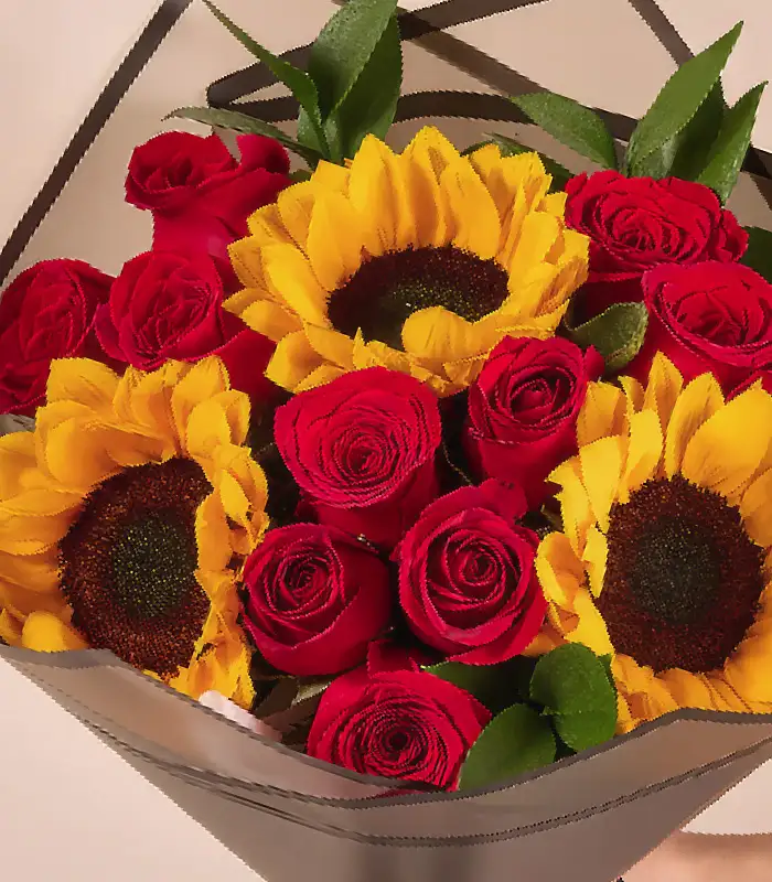 ¡El más pedido de 2024 y 2025! Precioso ramo de 12 rosas rojas con 3 radiantes girasoles. Envío a domicilio en Manta.